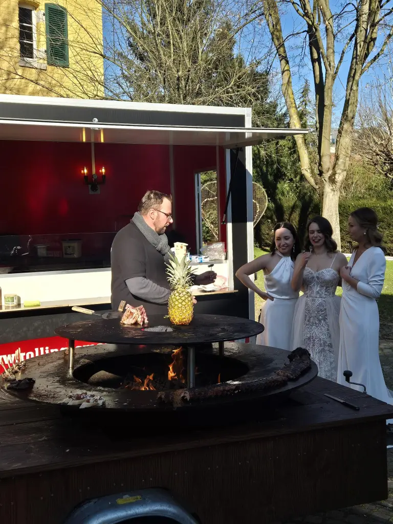 „Super sympathische Jungs mit einer genialen Idee. Der Rolling Smoker mit der mobilen Feuerplatte ist 1. ein Hingucker und 2. wahnsinnig lecker. Auch die Pulled Burger vom Catering sind einzigartig lecker. Buchen lohnt sich für jede Feier.“