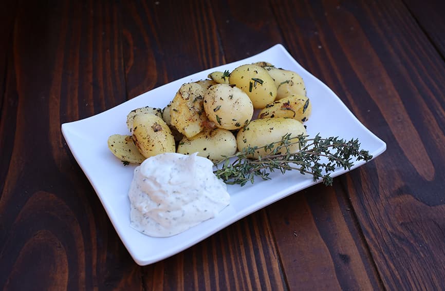 Regionale Kartoffeln, goldbraun geröstet und verfeinert mit frischem Rosmarin. Knusprig außen, weich innen und perfekt abgestimmt als klassische BBQ-Beilage – ehrlich, aromatisch und hausgemacht.