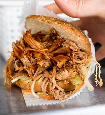 Zarter Schweinenacken, schonend im Buchenrauch gegart und vor Ort frisch gezupft. Serviert im handwerklich gebackenen Brötchen von Felix Backhandwerk – saftig, aromatisch und ein echter Klassiker.